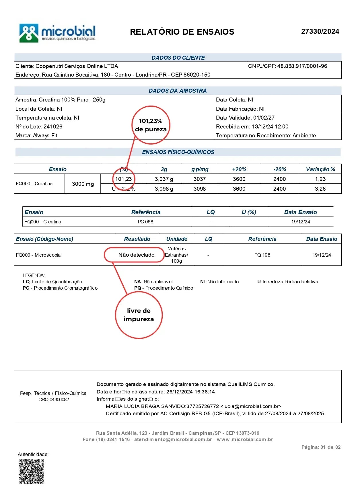 Laudo de pureza: Clique aqui para baixar